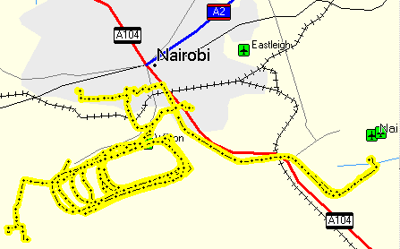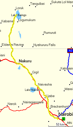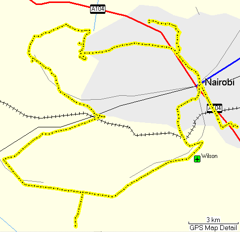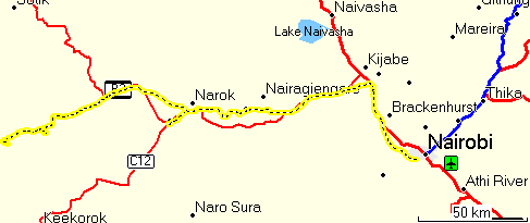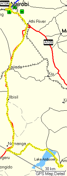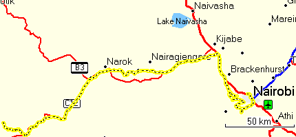 The first mobile phone transmitter seems to be in Ilbisil. Through Kajiado and Athi River I drove onto the Mombasa Road, where heavy and slow truck traffic slowed me down, so it took about three quarters of an hour to cover the mere 26 km to Nairobi. I still had to cross Nairobi, then moved into a private house of a friend for my last night before departure.