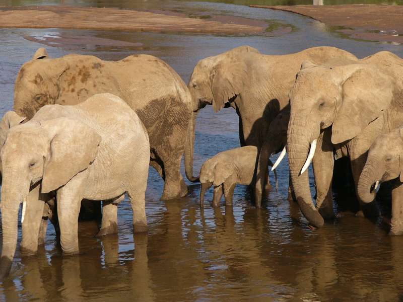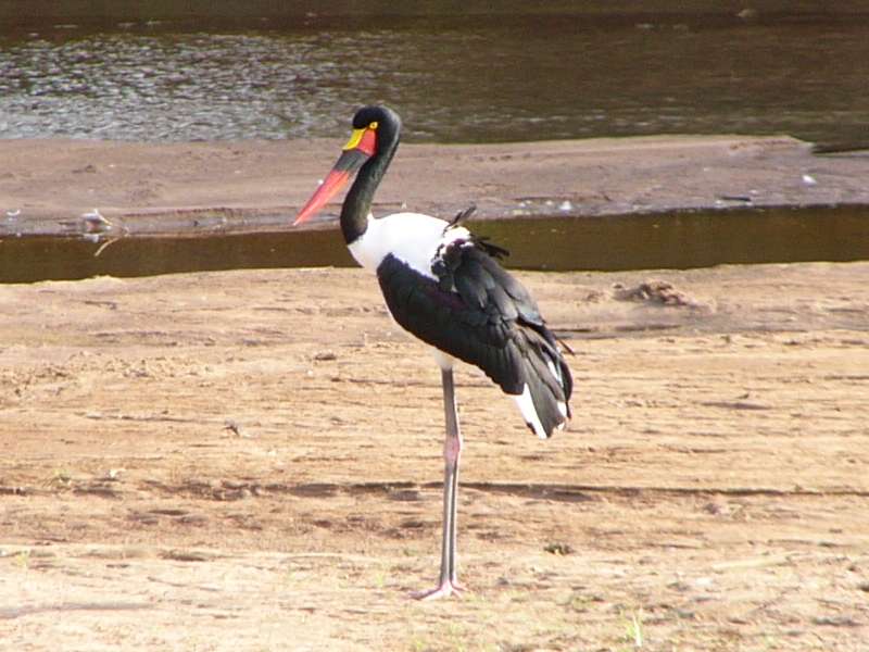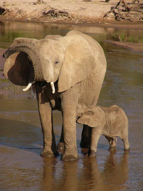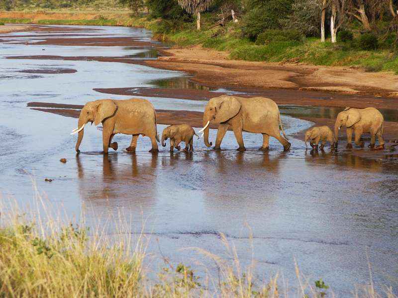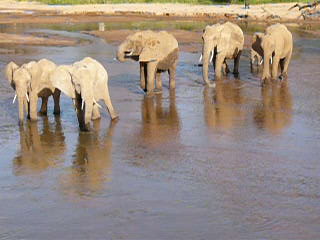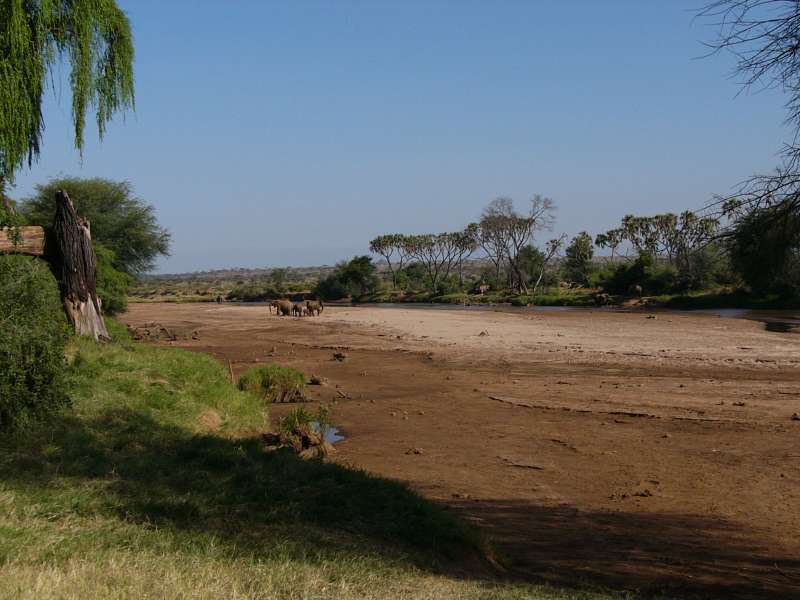 The now almost dry Samburu River; secretary bird; baby elephant suckling