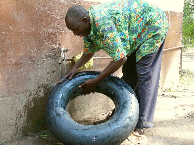 It turned out that the culprit was not an acacia thorn this time, but a nail that had survived an earlier repair and was now sticking out of the inside surface of the tire by about 3 mm. This nail had poked a fairly big hole into the tube, but there were also two smaller holes that had escaped discovery until now. Anyway, the acacias have my apology for this puncture.