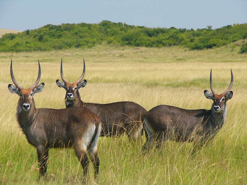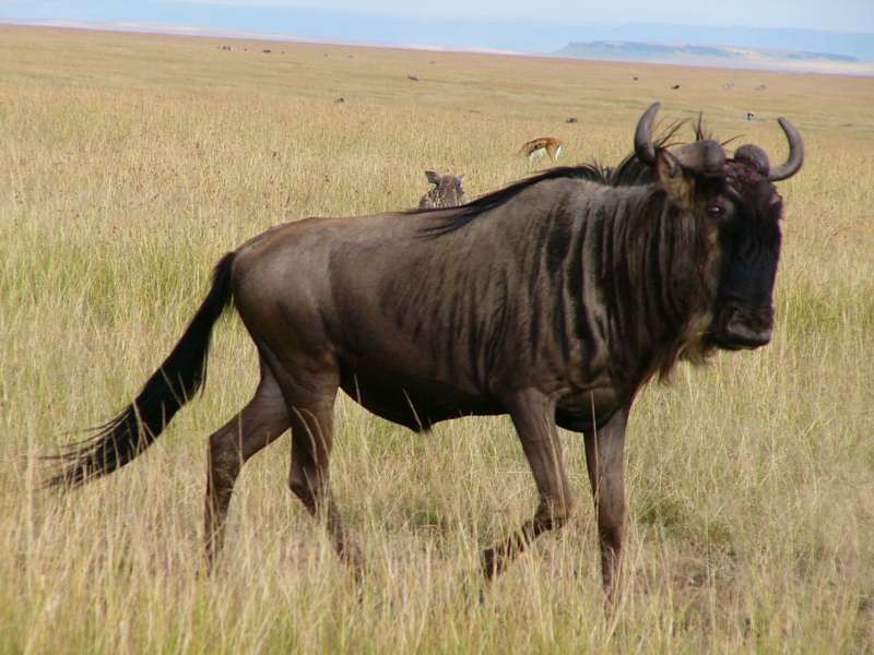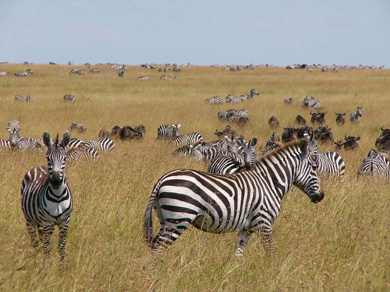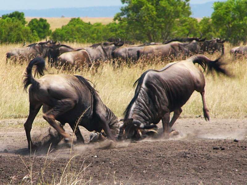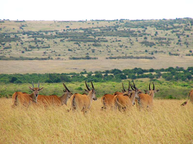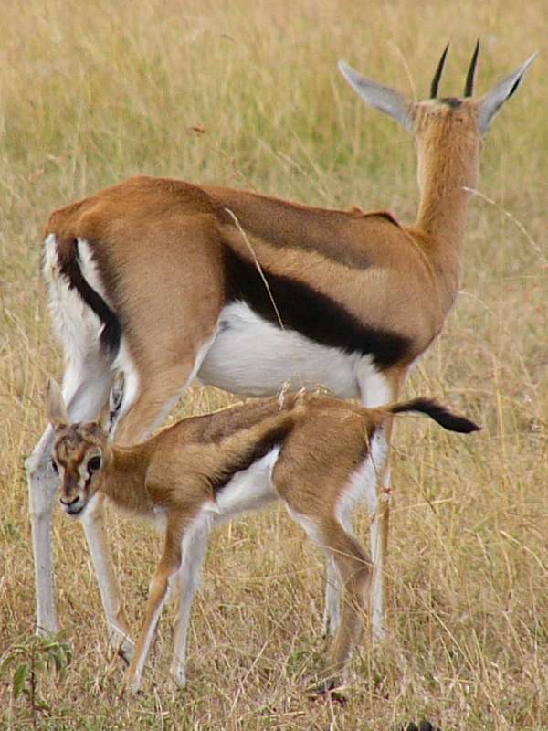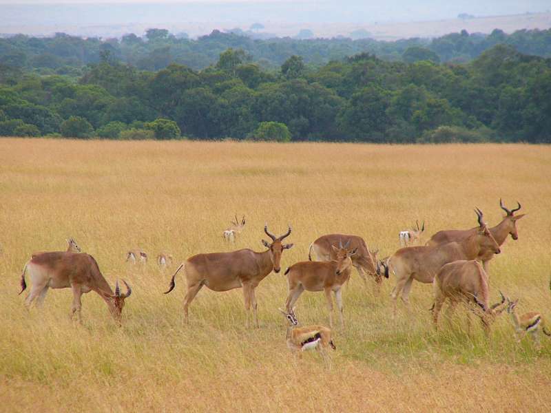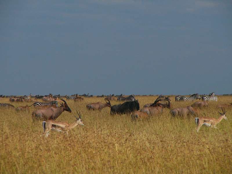 Grants gazelle, topi, gnu, zebra; gnus congregating at Talek River for drinking