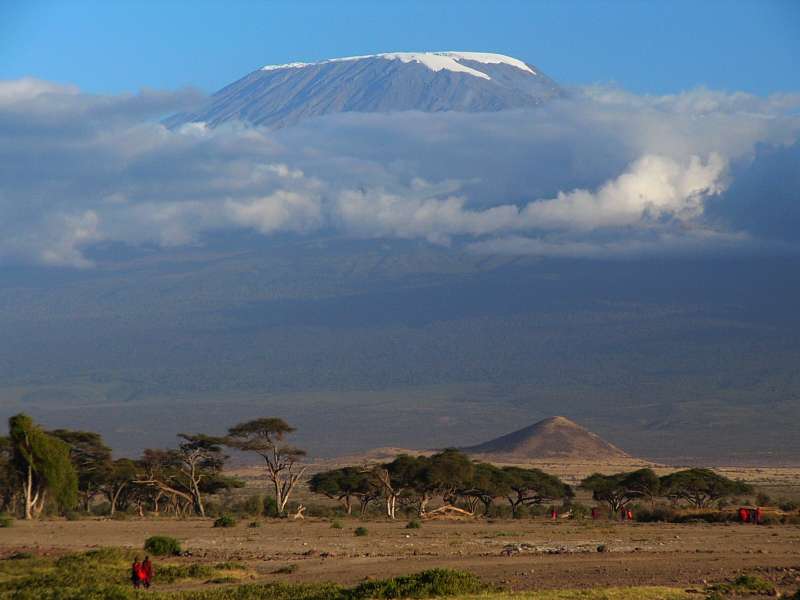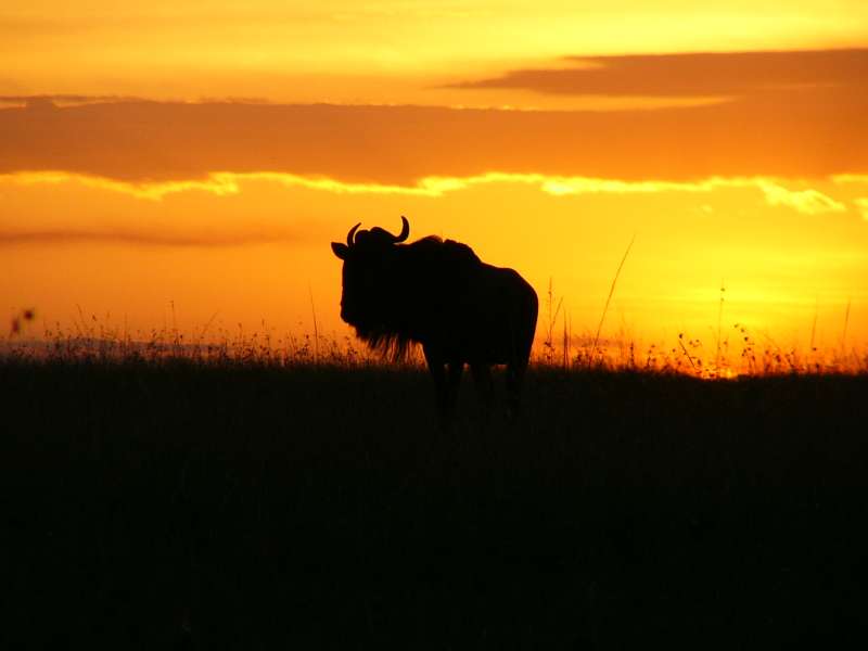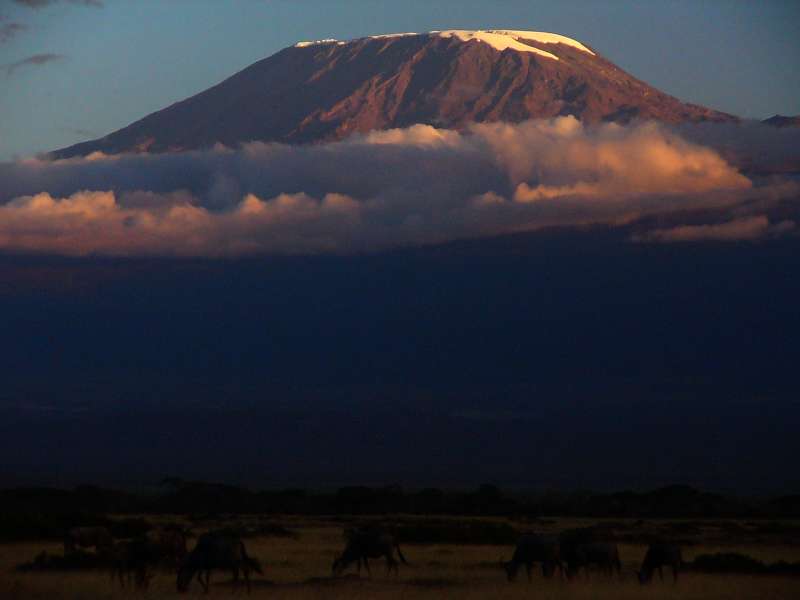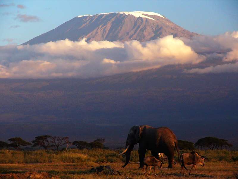 Some Kilimanjaro pictures as the sun sets: car; Maasai; elephant bull; wildebeest