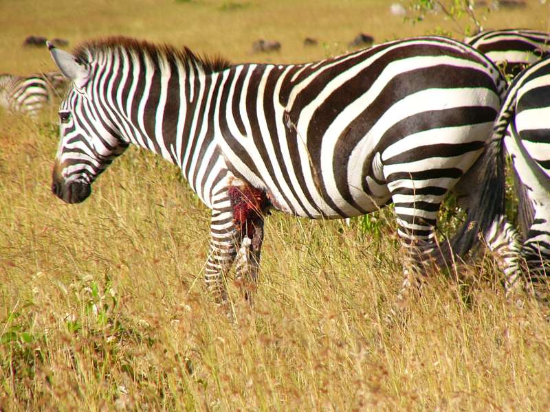 This zebra may yet die because of infection with various microscopic and macroscopic parasites. The wounds look rather bad to me. But then these African animals are incredibly tough.