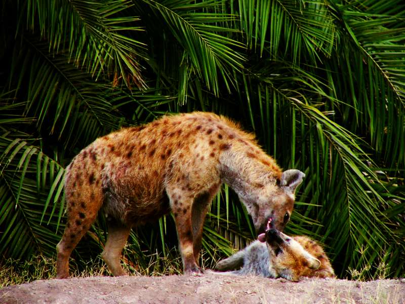 Hyeana mother licking her child; hyaenas on patrol; vultures