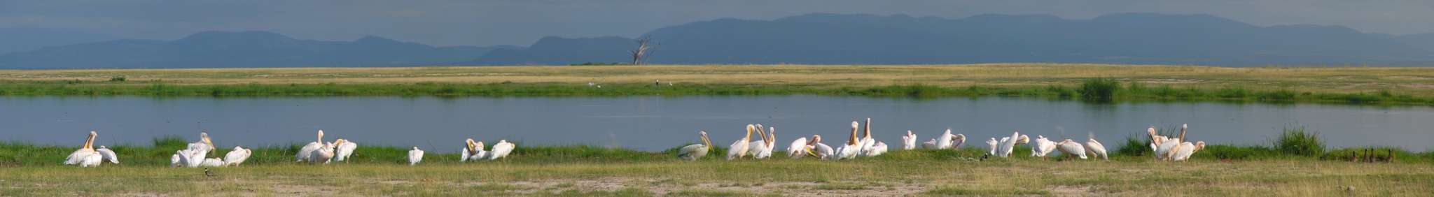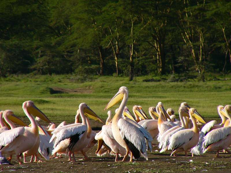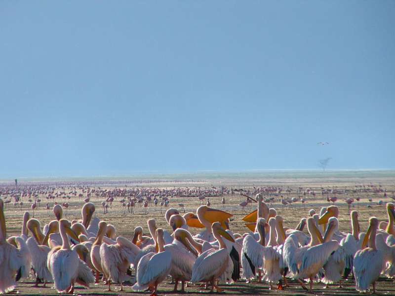 Pelicans and flamingos at the southwestern shore of Lake Nakuru