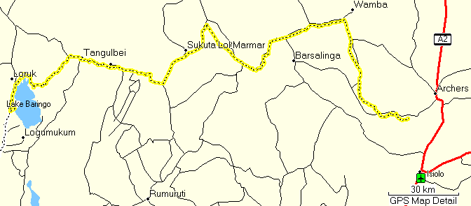 We had already heard that there was a tribal war going on, Pokot raiding Njemps, mainly to the east of Lake Baringo. Our main worry was rampaging groups of people with firearms who might take on the occasional tourist car. But we also heard that a few tourist minibuses had gone through in recent weeks and that the road we wanted to take should not be affected.