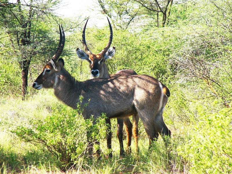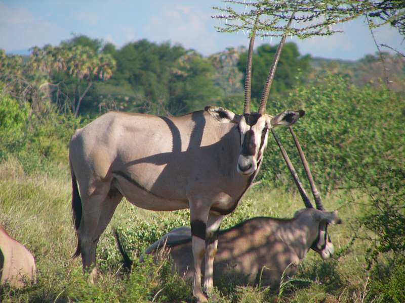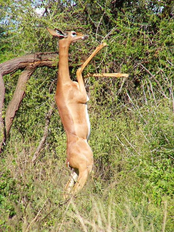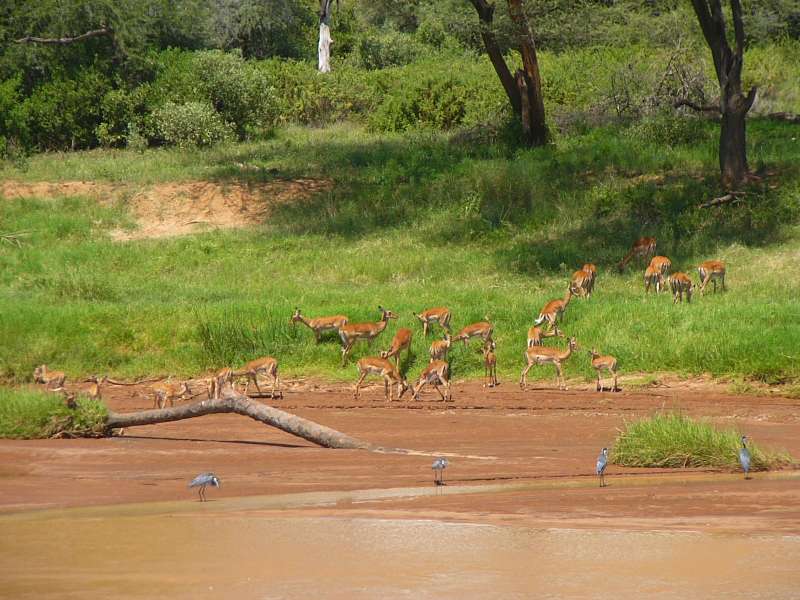 On the remaining distance to Samburu Lodge we met a group of elephants and watched them for a little while, and we saw several gazelles including the tiny dikdiks that we had already seen in Baringo and along the way, and waterbucks.