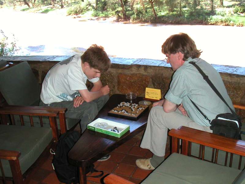 Insects swarming in front of a lamp in the Samburu Lodge; a game of go on the pavilion