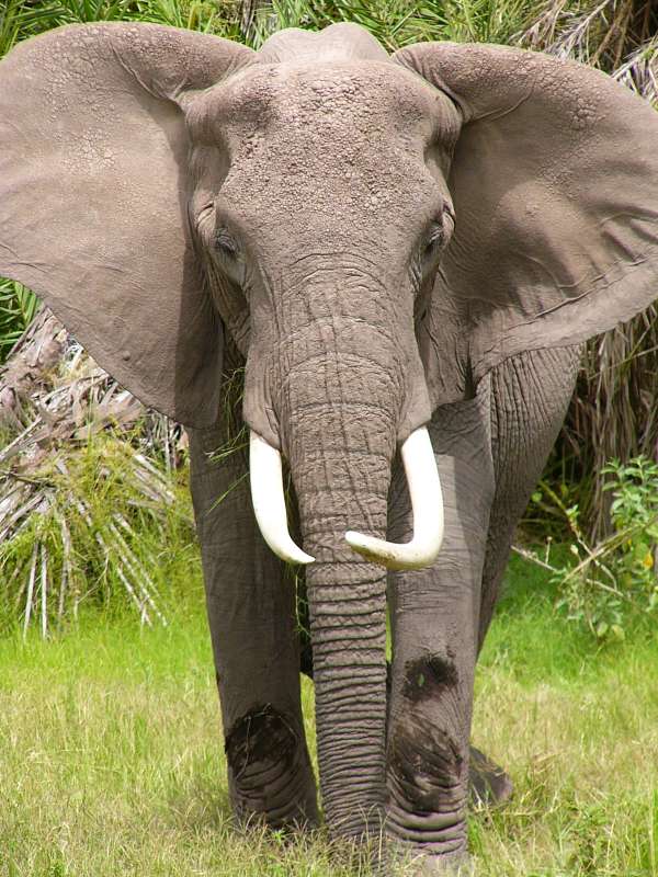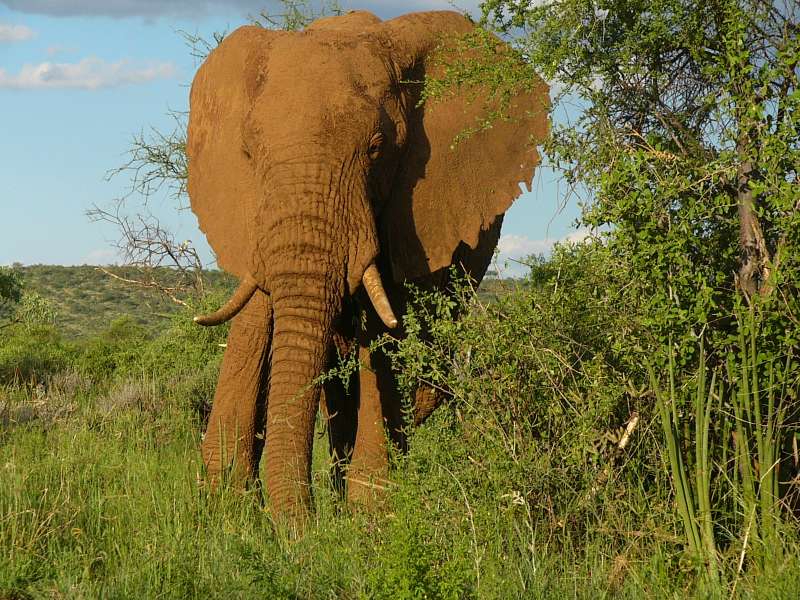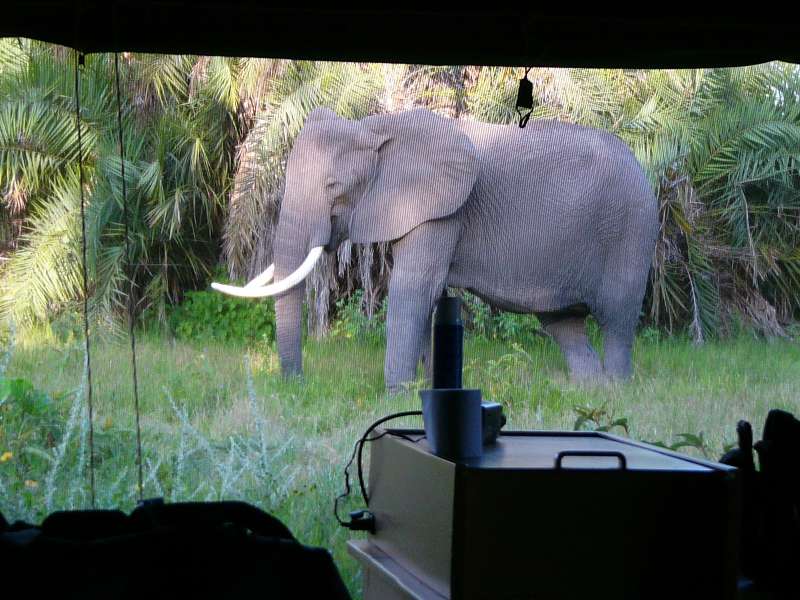 When I came back into the camp, I drove backwards past my tent as usual, then positioned the jeep with the battery close to the tent to get electricity. Only after I had parked the jeep and jumped out, I noticed that a lady elephant, Ella, was standing not much more than 10 m away, eating grass.
