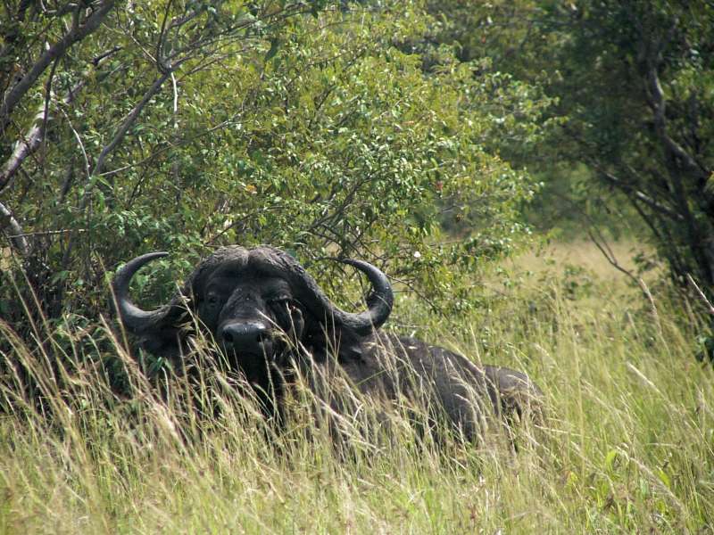 Hyaena hiding under a bush; a black-bellied bustard family; buffalos