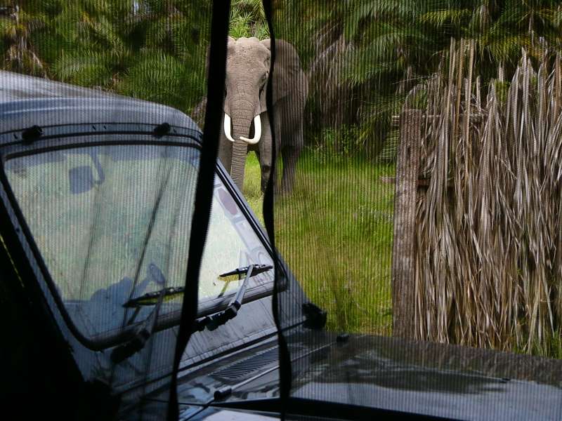 I tried to tell her that I'm peaceful by imitating an elephant voice, and indeed she continued to come closer. My intention had been to open the hood to get at the car battery, but I delayed that, so as not to do anything unusual that could frighten her. Instead I took the photos above, then went into my tent and watched her graze while I was resting on my bed. She stayed with me for another 15 minutes, then went away to rejoin her group, which I could hear behind the bushes.