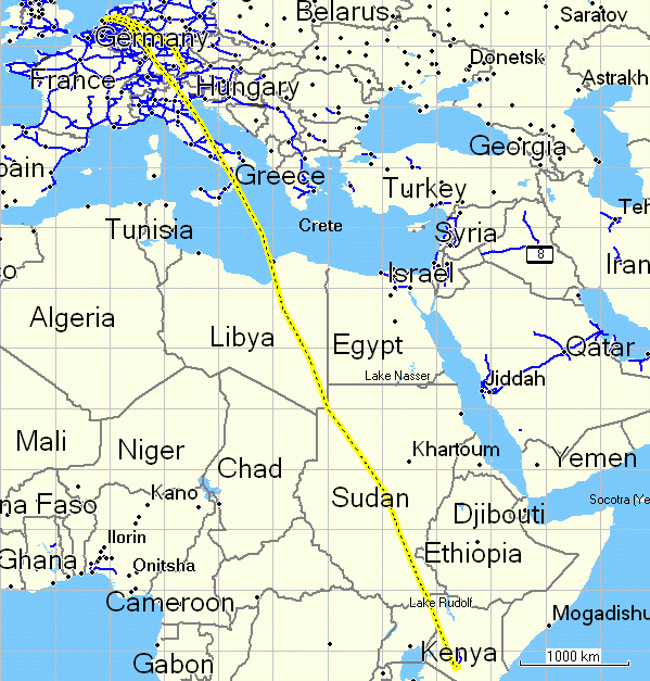 During both flights I had the GPS at the window, so here's the track. On the long flight I had put my little bag on the armrest and arrested it with the tray table. Then I put the GPS on top, touching the window with the antenna side, and that yielded a totally stable reception. This has become better, since the GPS now works on 30 satellites, rather than the required 24, and there are even a few more geostationary ones for WAAS, EGNOS, and the Japanese system, of which I received the two EGNOS satellites the whole time and had an EPE (Estimated Position Error) of typically 2 to 3 m.