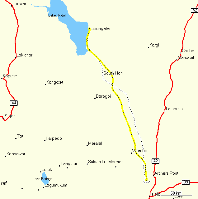 The two jeeps headed north to Loruk, then east to Samburu on the most remote route of our entire journey, via Tangulbei – Churo – Mugie – Sukuta lol Marmar – Kisima – Lodungokwe – turn south before Wamba – near Ngotogongoron (school ruins) – Samburu west gate – Samburu Oryx airfield to the Samburu Lodge.