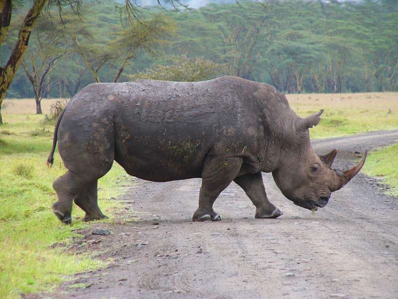I drove on and had to stop, because two rhinos (not the same ones) stood on my path, a dam through a swamp. I stopped and waited, when the bus came and passed me. Some 30 m in front of the rhinos the bus driver stopped. Then he moved forward a few meters and repeated this a few times, until he was perhaps 10 m from the rhinos. Only then they gave in and very slowly moved down from the dam, freeing the way for the bus.