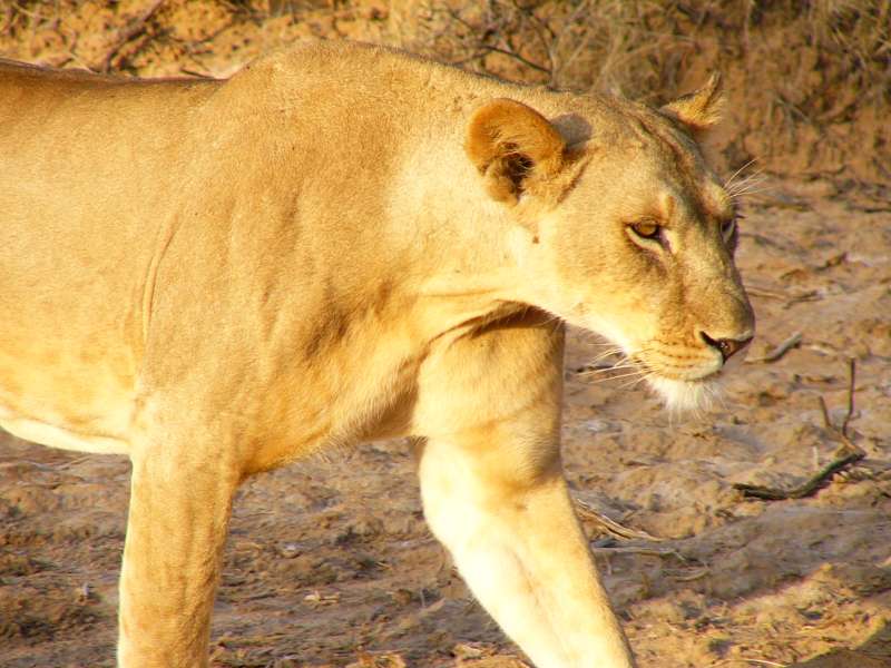 I followed them almost back down to the river, then had to leave them to drive out. The next I met was a family group of elephants, almost blocking my way. I spent some time with them, then drove on, only to meet two lions, a male and a female.