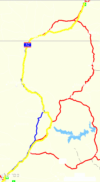 The road was recently redone past Naivasha and on to Gilgil. There I hit the road builders. The road was blocked and traffic diverted over an old, unpaved road. On the shoulder of a hill the water had washed out a deep hole, blocking half the road. For the limousines it was difficult to get around it, because they first had to convince the oncoming traffic to stop at enough distance from the hole, so they could drive around it. So some drove through it, and I'm sure a lot of cars were damaged there, like the exhaust broken or bent. No problem for my jeep, fortunately.