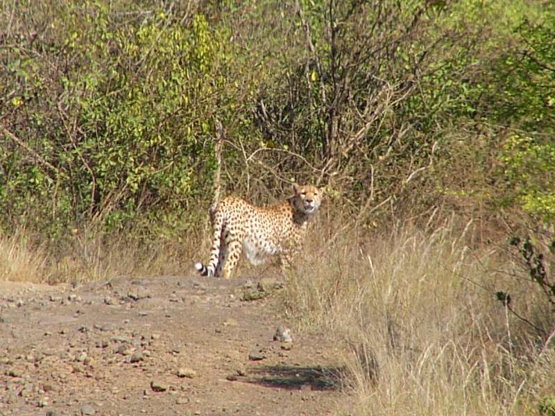 Driving on towards Finch Hatton's camp, I met a cheetah on the track, but he was very shy and kept running away until he finally turned off into the high grass.