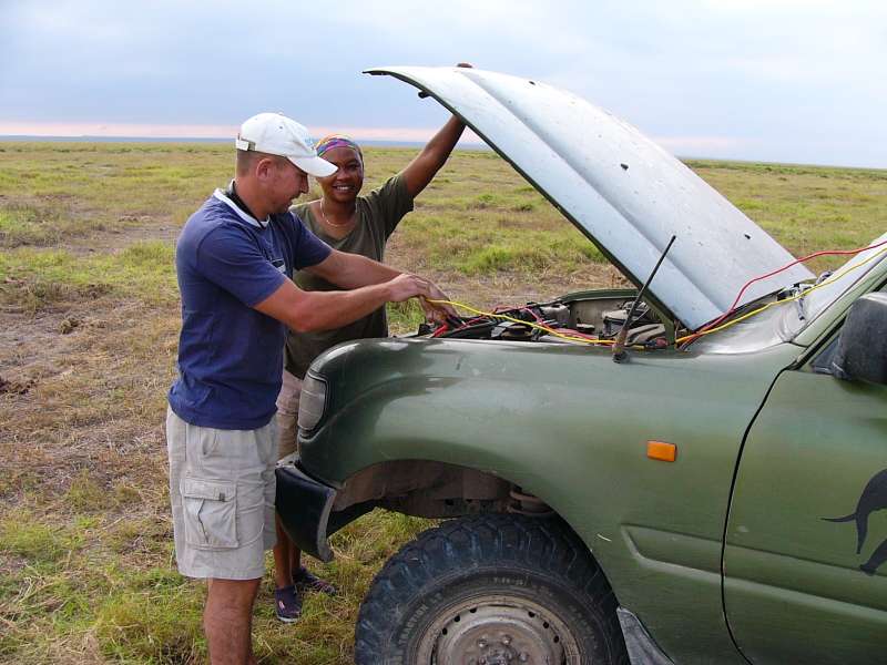 The rear door lock failed, as usual, after the Amboseli dust. Dust collects inside the lock and limits its movement. There's no easy solution for that, apparently. In the workshop they take the door apart and clean everything, and then it works again. The windshield washer jets somehow slipped in and disappeared in their hole, such that I could now wash the interior of the dashboard, rather than the windshield. No big deal. And I actually damaged the end of the exhaust pipe by going through a ditch that was slightly too deep, so I squeezed the exhaust between the rear bumper and the ground, making it oval, rather than round. No big deal either, and I can't blame the car for that.