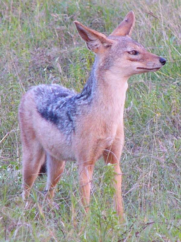 While I was watching, four jackals appeared, and the boldest or hungriest one tried to pinch a bit from the buffalo, but the lions wouldn't tolerate that and chased the jackal away.