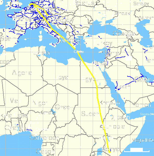 I had not been aware that Kenya Airways now also, like KLM, has an online check-in. This lack of information cost me the window seat, I could not see northern Kenya and the Nile from above, and I cannot show you a GPS track of the flight back home.