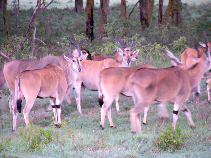 I didn't find them. Most likely they had moved on, otherwise I would have heard them in the morning. I drove with both windows open, so I could hear and see better and the mist would not condense on the windows, and it was cold, but beautiful. The first conspicuous animals I saw was a herd of eland, the same I had already spotted last evening. They blocked my way and didn't want to flee out into the open, so they didn't really know where to go and could only circle my car. I did take a photo, even though there was no suitable light.