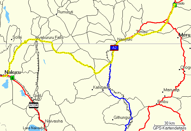 It did turn out to be too time-consuming. I drove the fastest way, or so I believed, to Nanyuki via Subukia, Nyahururu (Thomson Falls), Naro Moru, Nanyuki to Isiolo. On this trip I learned once more that Kenya does not have a complete road network. The roads between Nyahururu and Nyeri that I intended to take were unpaved tracks that would have taken a lot of time. So I asked matatu drivers, who know all the roads and shortcuts, and they sent me on towards Mweiga and Nyeri, which involved driving away from my next waypoint, Nanyuki. When I noticed, I asked another matatu driver, and he said, yes, that's the way. There is a shortcut, but he was worried that I would get lost trying to find it.