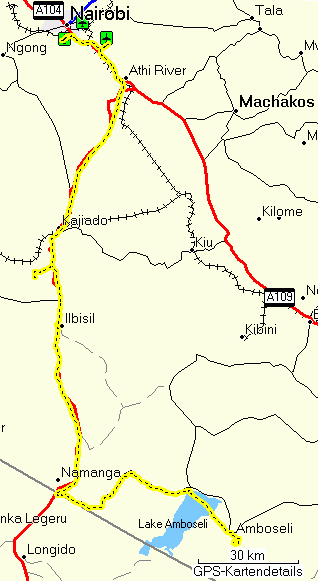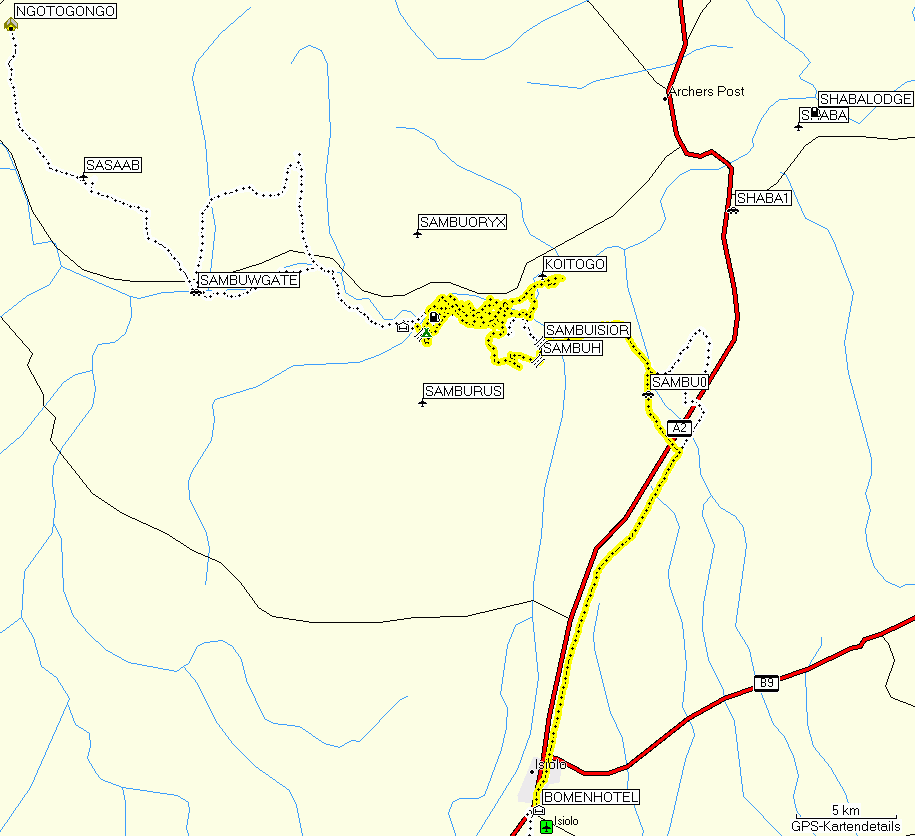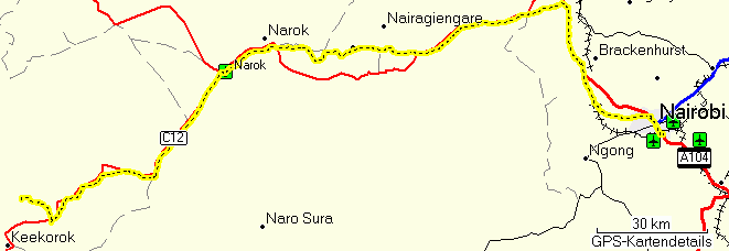 So I drove on, but soon realized that I actually knew that shortcut, because I had used it to get from Nanyuki via Naro Moru on the foothills of Mt. Kenya to The Ark, a forest night lodge near Mweiga. I even had the route in my GPS receiver, so I reversed it and drove the shortcut. It was, and still is, a bone-shaking, stone-based single track of some 20 km. On the GPS map above the shortcut is the straight bit that eventually hits the A2 highway.