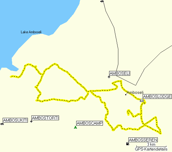 I drove off again, used a new way to Kitirua Gate, which led me unexpectedly to the Amboseli Tortillis Camp, one of the very classy lodges in the area. I briefly inspected the lodge. It looked very good to me. Then I drove on and found a big airfield next to the lodge, which I measured and put into my East Africa GPS waypoint list. Then I drove on through Maasai country.