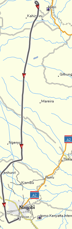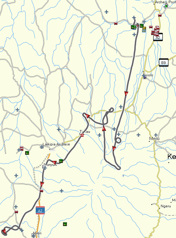 I could not find out whether the required calls are only at the Mt. Kenya Safari Club and the control zone boundary south of Naro Moru and east of Timau or whether you are also expected to call overhead Naro Moru and Timau. I have also been told that the restrictions are often relaxed and allow straight routing towards Nanyuki Civil from any direction, as long as one keeps a distance of 5 nm from Laikipia Air Base (which is not always quite possible near Nanyuki Civil).