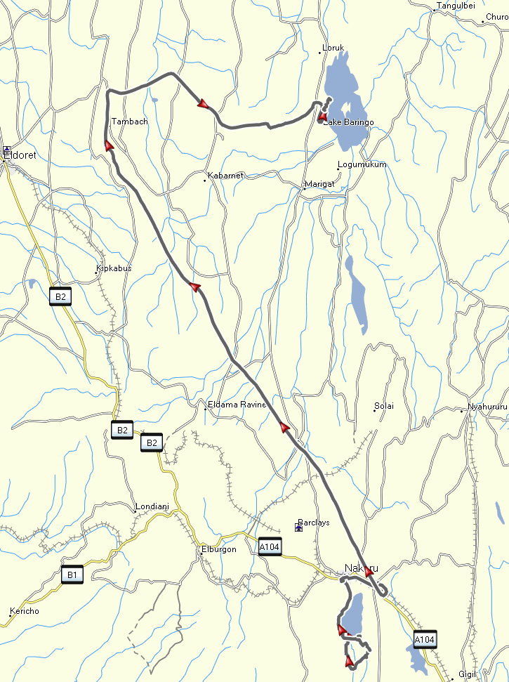 The route took us on a triangular journey from Nairobi Wilson up the Rift Valley to Baringo, then out to Samburu in the east, and back past Mt. Kenya via Mweiga to Nairobi Wilson. We refuelled twice at Nanyuki Civil.