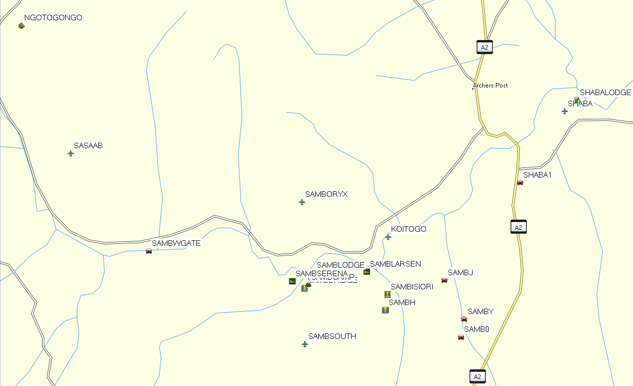 Airfields, lodges, waypoints in Samburu and Buffalo Springs.