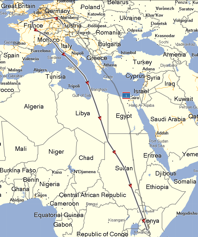 The intercontinental flight was unusual in that it formed an easterly arc, passing over Khartoum, Sarajevo, and Graz, north of Munich and Nuremberg, to Amsterdam. Most of these flight lead over or along the western coast of Italy, i.e. much farther to the west (see track map at the top).