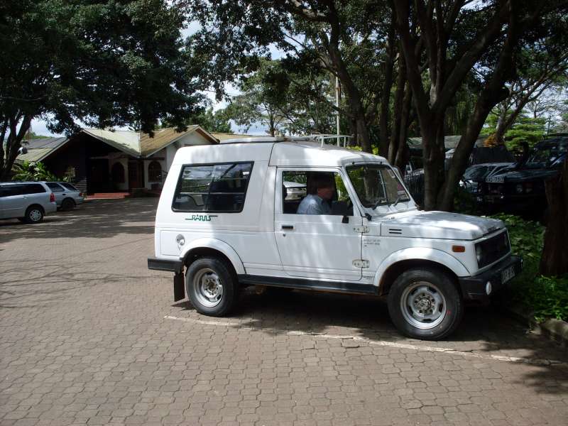 Our white Suzuki Maruti Gypsy in front of the Aero Club of East Africa