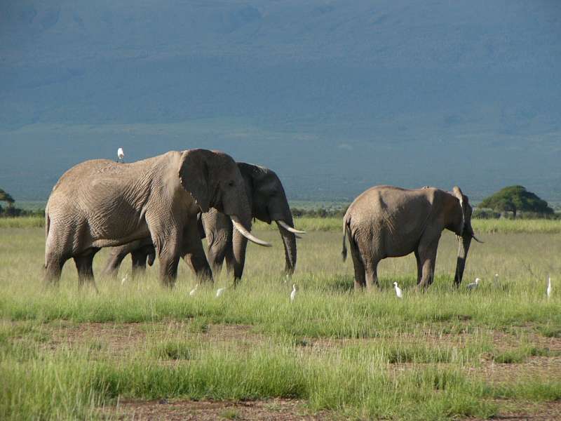 After cups of tea and coffee we set out for an early-morning game drive along the main Amboseli swamp, which was very beautiful and successful. Kilimanjaro was mostly clear of clouds in the early morning, but gradually grew its typical cloud cap later. We even saw two male lions, though not in a suitable situation for photos.