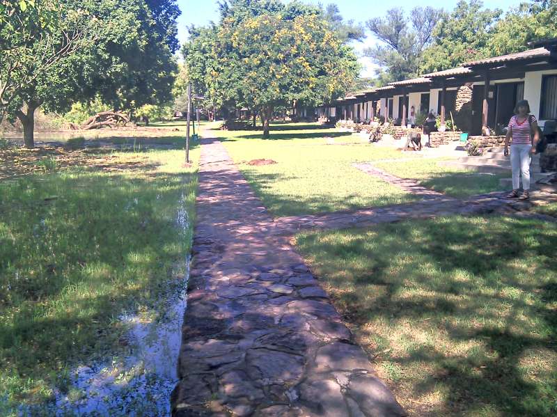 Most of the lodge lawn is flooded. Only a small stripe remains dry, but even that feels a bit swampy.