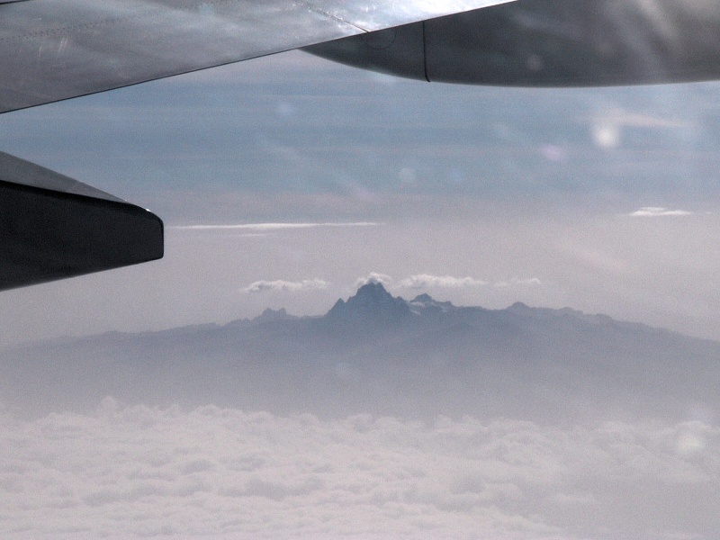 After boarding, the plane did not undock. It turned out that airport security pulled one passenger from the plane, then the workers had to unload the luggage again to identify and remove that passenger's luggage. Finally the plane was searched for his hand luggage. All this took another hour. Then we finally took off and had a nice, if somewhat late flight to Nairobi. The route led us past the wonderful Mont Blanc, along the Italian coast, aross the Mediteranean Sea, over Benghazi into Lybia, unusually not over Sudan's capital Khartoum, but well to the West of it, so we saw the river Nile only briefly, when crossing it later, and, after nightfall, into Kenya. We landed in Nairobi three quarters of an hour after the scheduled arrival time.
