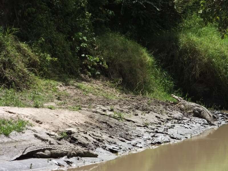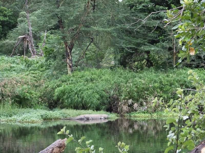 On the parking before Mzima Springs I chatted with the four rangers for a while (three men, one woman), then proceeded to walk down to the spring. After looking for a while at the water pouring out of the volcanic rock structure, I continued down past the upper lake and saw a big crocodile on the opposite shore.