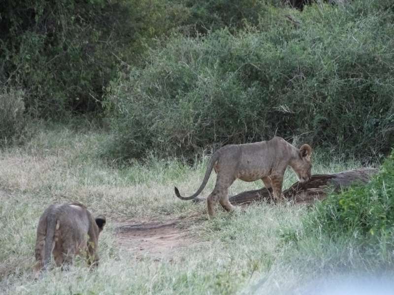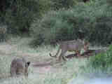 On our way back to the lodge around sunset we spotted a lioness with her cubs in the bushes near the river.