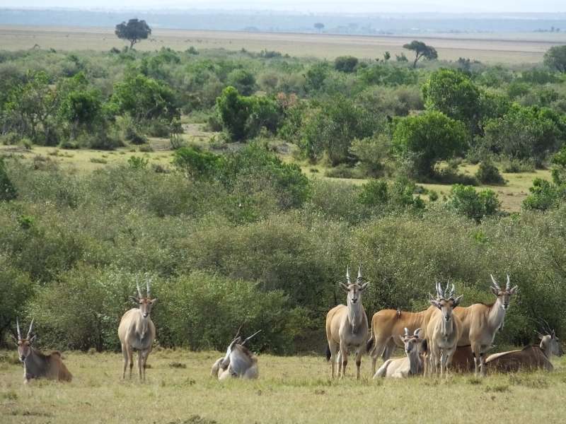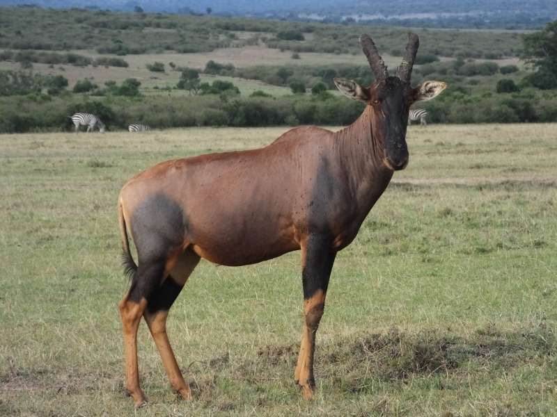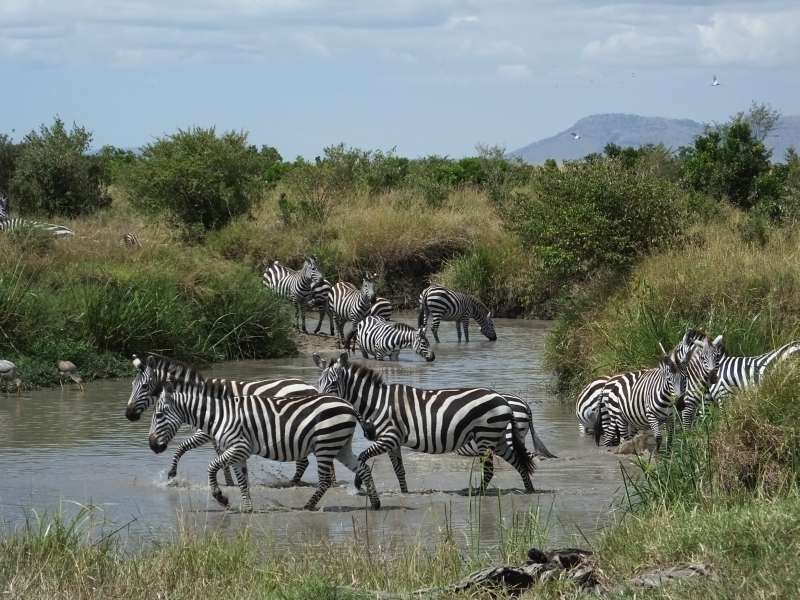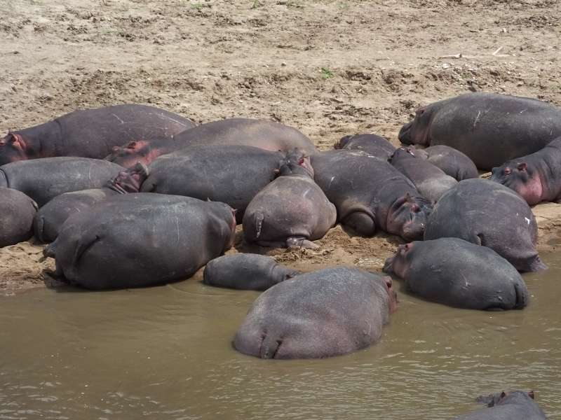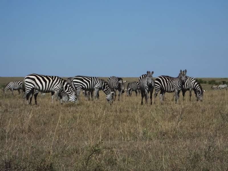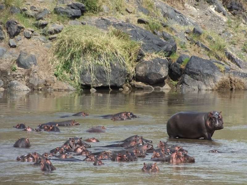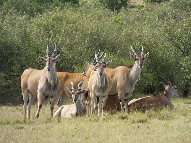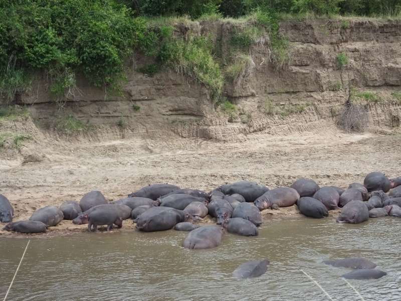 In the afternoon we drove parallel to the river Talek in the downstream direction to a point where we knew that hippos stay there in the river. Along our drive we saw more zebras, a group of wildebeest, giraffes, and eland among gazelles and other animals.