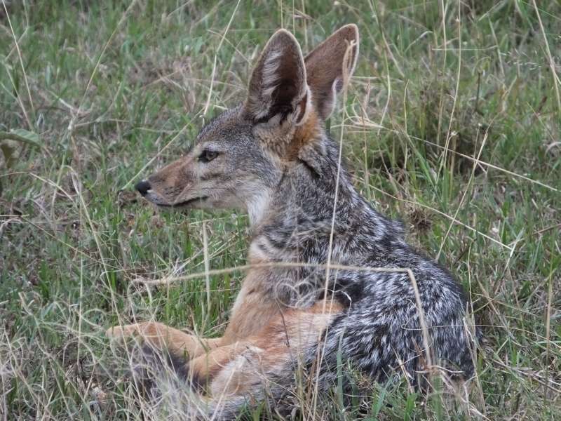 A young jackal sat in the grass very close to our car, but still we almost overlooked it. It did not want to move and was not particularly afraid of our car.