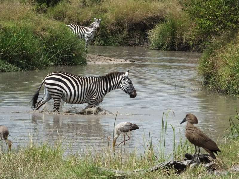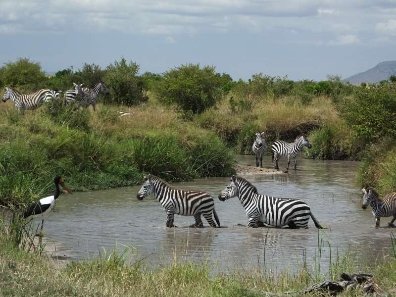 Zebras, also Saddle-billed stork, Yellow-billed stork, hamerkop