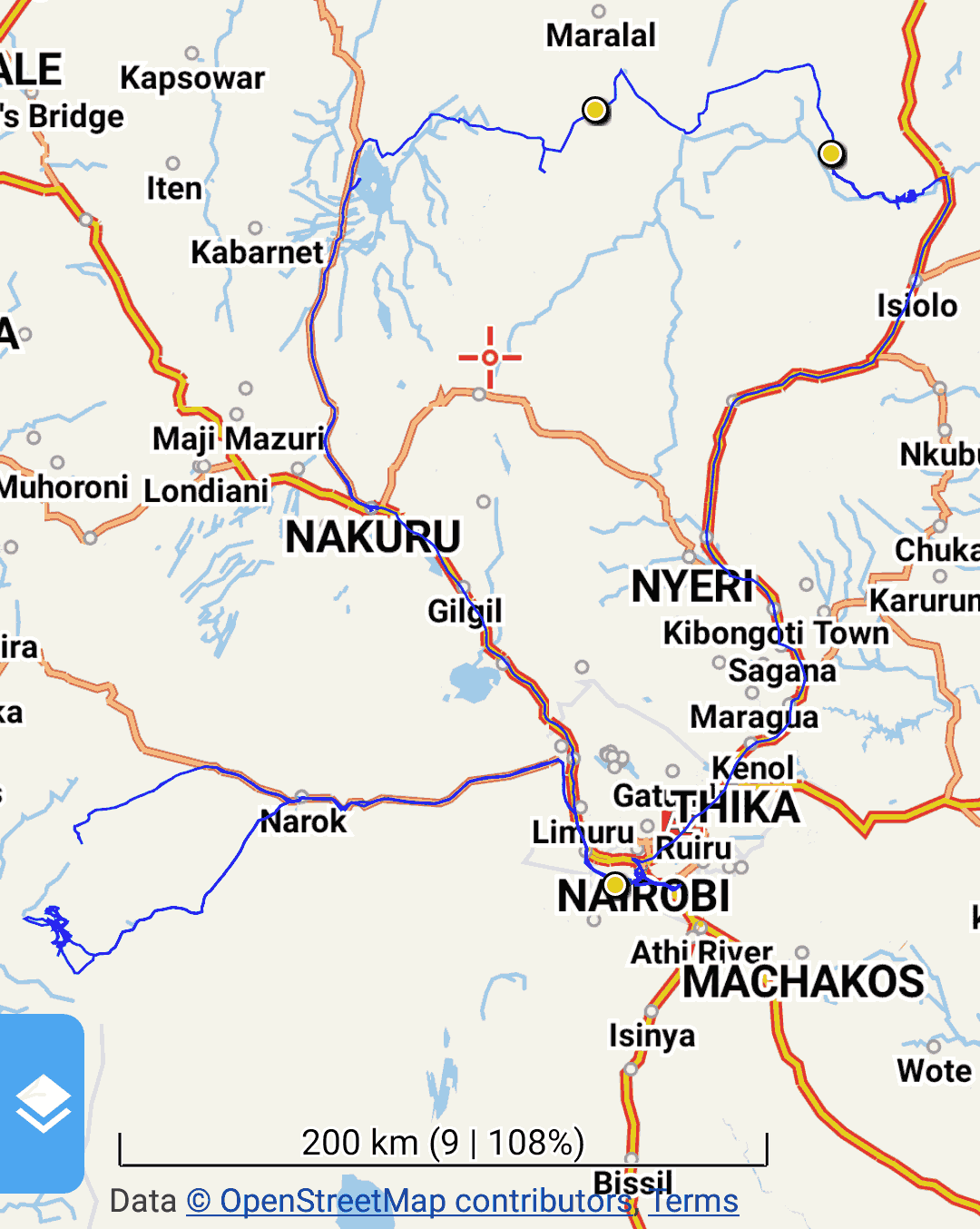 The first third of the way took 5 h on gravel roads, the remaining two thirds took 3 h on tarmac (paved) roads. The road that climbs out of the Rift Valley was slow, because of slow trucks that are not allowed to take the faster highway to Nakuru.