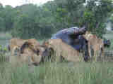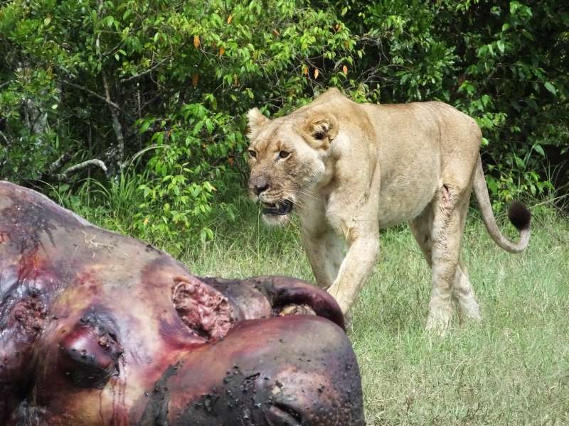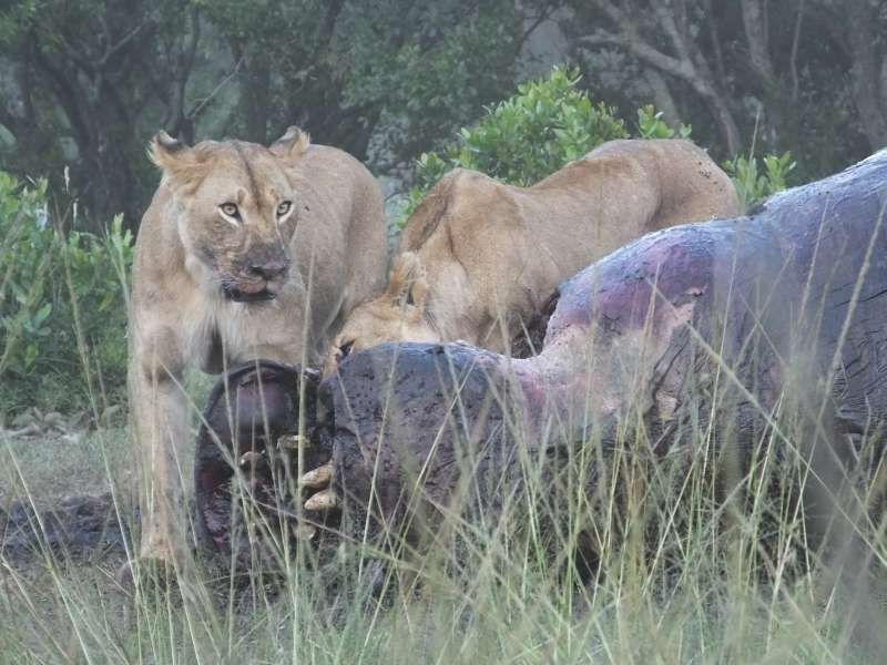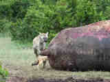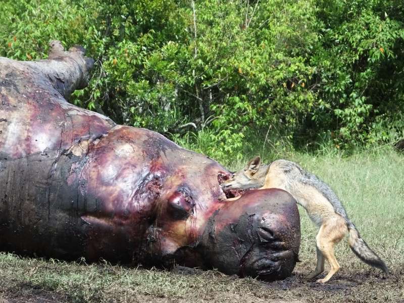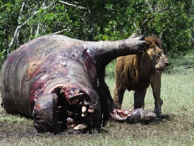 Hippo carcass, lions, silver-backed jackal, hyaenas, vulture