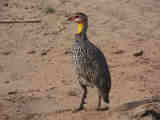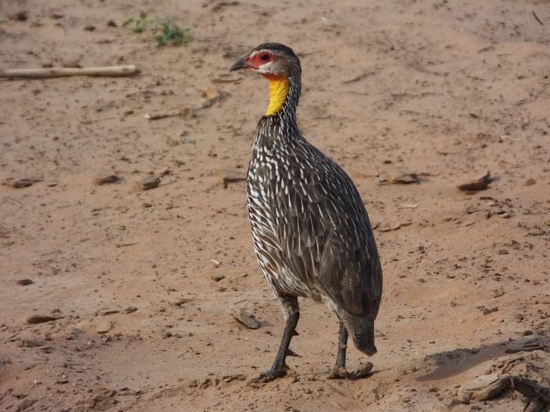 Yellow-necked spurfowl; white crane; elephant; dikdik pair