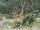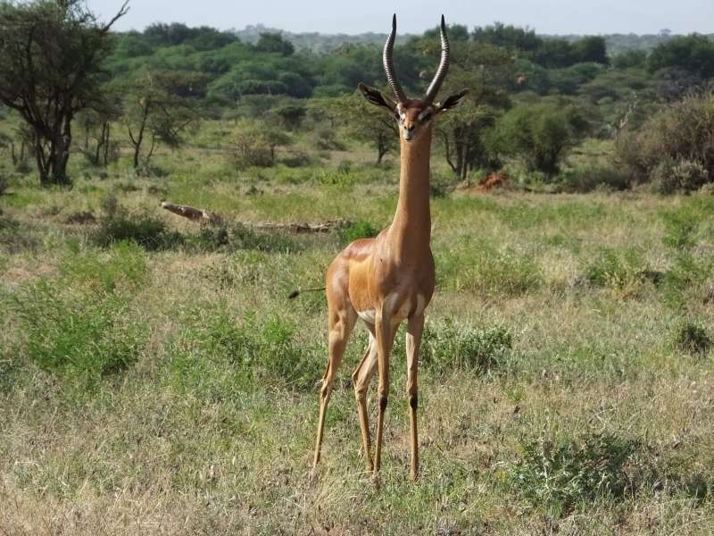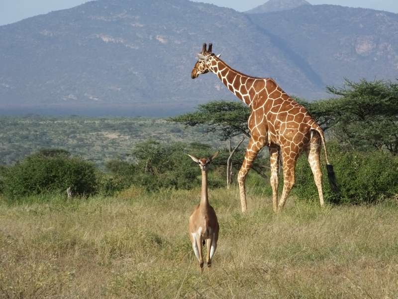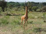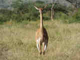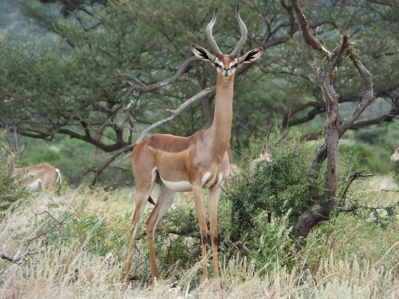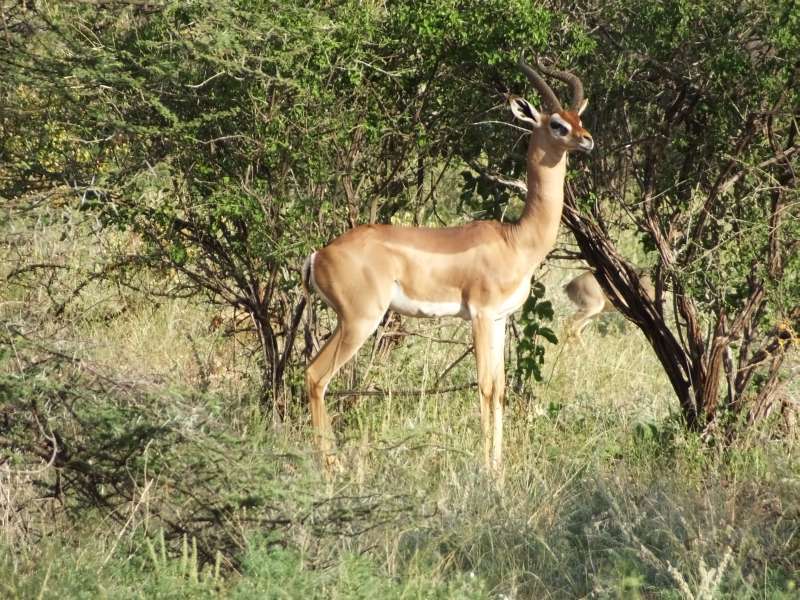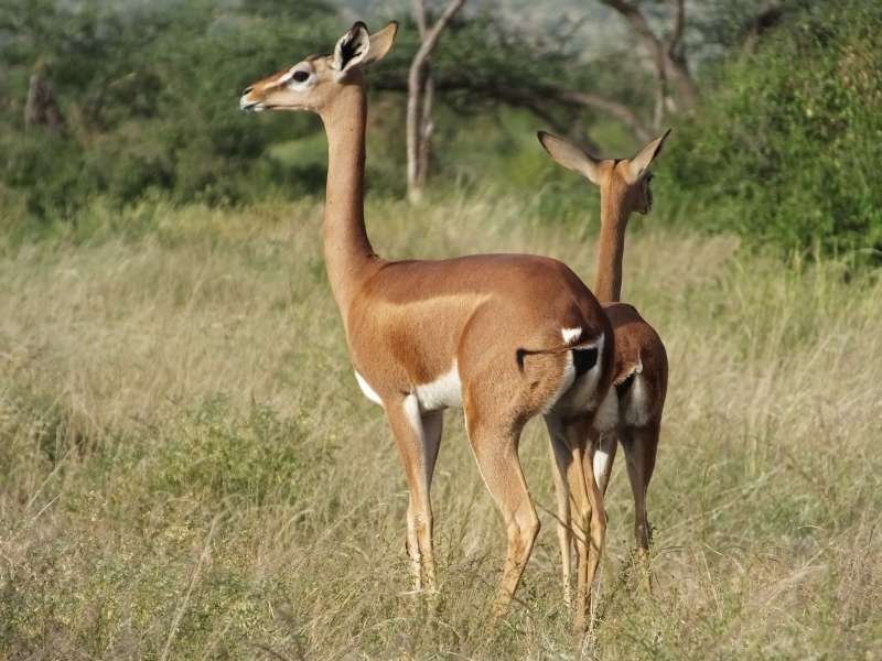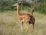 Gerenuk mother and child; gerenuk female; gerenuk with giraffe; gerenuk male