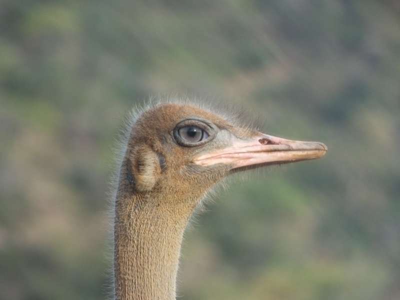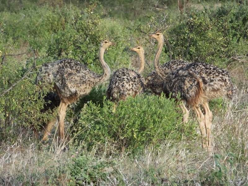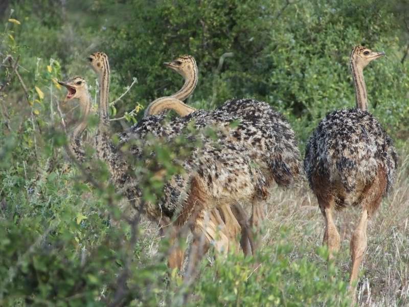 One early morning I found a male and a female ostrich (female not photographed) and took some photos, when I noticed that between some bushes there were 5 ostrich chicks sleeping, huddled together in one big lump. They slowly woke up and started to move. I had never seen ostrich chicks like this.