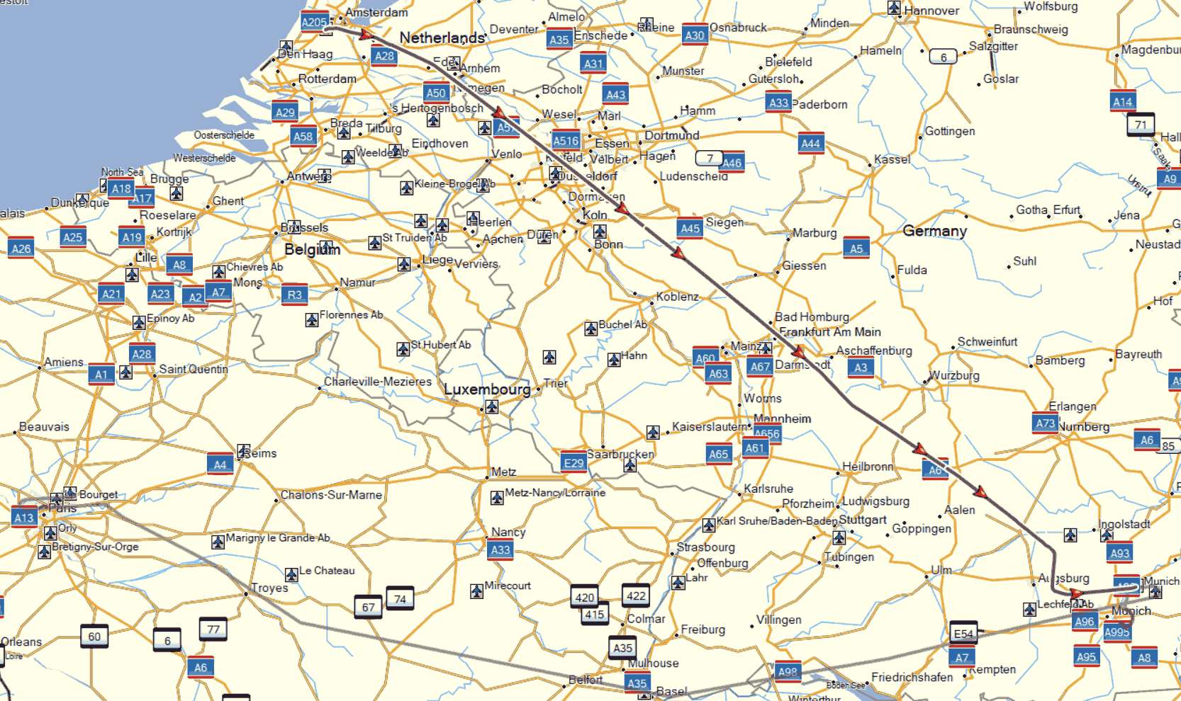Route Nairobi - Amsterdam (detail); route Amsterdam - Munich