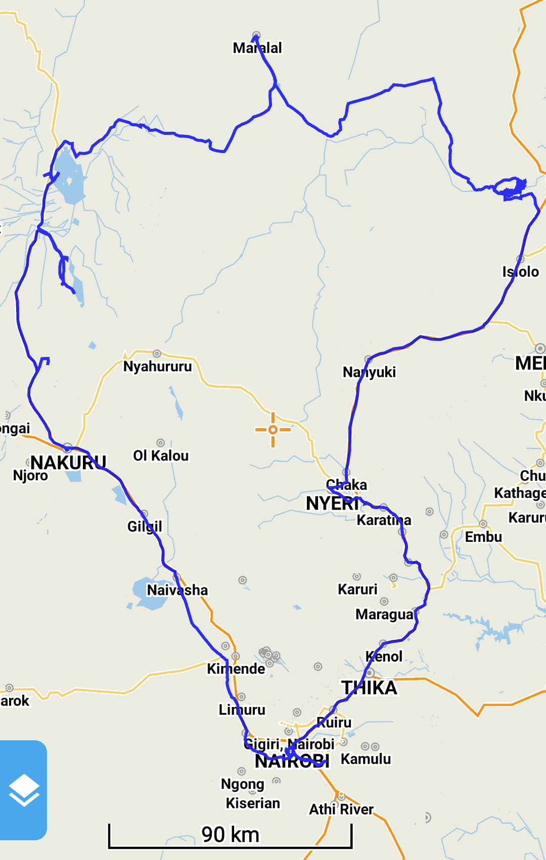 After a plentiful breakfast (knowing that we would skip lunch) we leisurely packed everything into our car and drove out of Wilson Airport. In the Shell petrol station at the entrance to the airport we checked our tire pressure (was somewhat too high on all four wheels, but slightly low on the spare wheel), filled up the almost empty windshield washer water tank, and checked whether we really had a 4-wheel-drive. The Toyota RAV4 is also available as a front-driven two-wheel-drive version. I believe I saw all four axles, so that was OK. It would not be very clever to import a two-wheel-drive version of the RAV4 into Kenya anyway.
