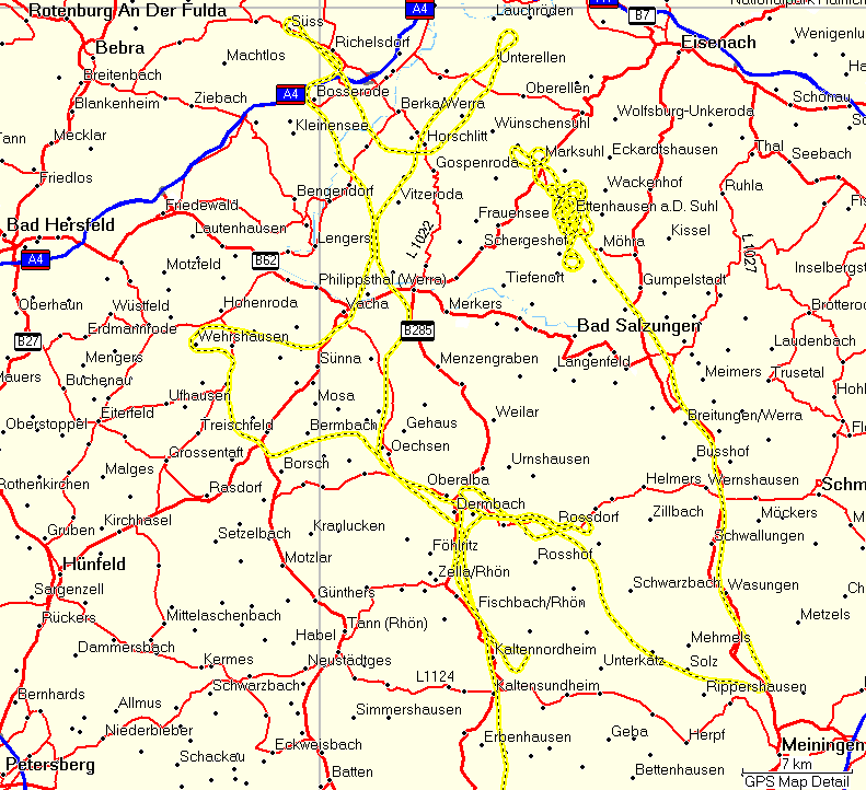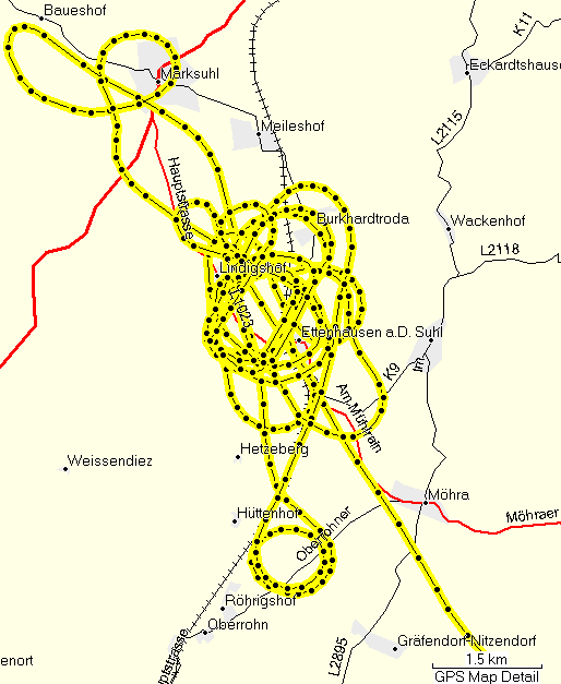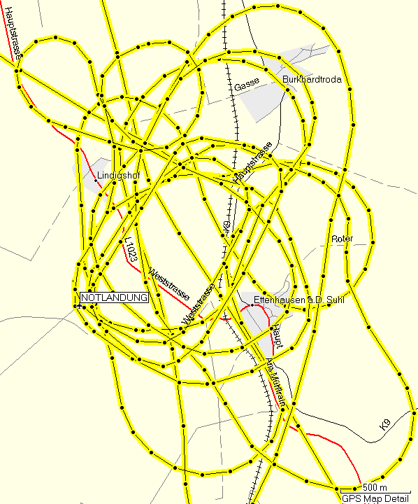 Nachdem ich ohne ernsthafte Probleme bis in die Gegend von Eisenach geflogen war, verschlechterte sich die Wettersituation wider Erwarten erneut. Ich befand mich auf der Südostseite des Thüringer Waldes, teilweise nur 10 km vom Ort Eisenach entfernt, konnte aber den Kamm des Thüringer Waldes nicht überfliegen und Eisenach nicht erreichen. In Richtung Norden kam ich etwa bis neben Eisenach, aber dort versperrten mir tiefliegende Wolken und örtlicher leichter Regen den Weg. Der Regen wäre an sich kein Problem, aber er beeinträchtigt die Sicht zusätzlich so, dass man manche Wolken in Kombination mit dem Regen nicht gut erkennen kann.