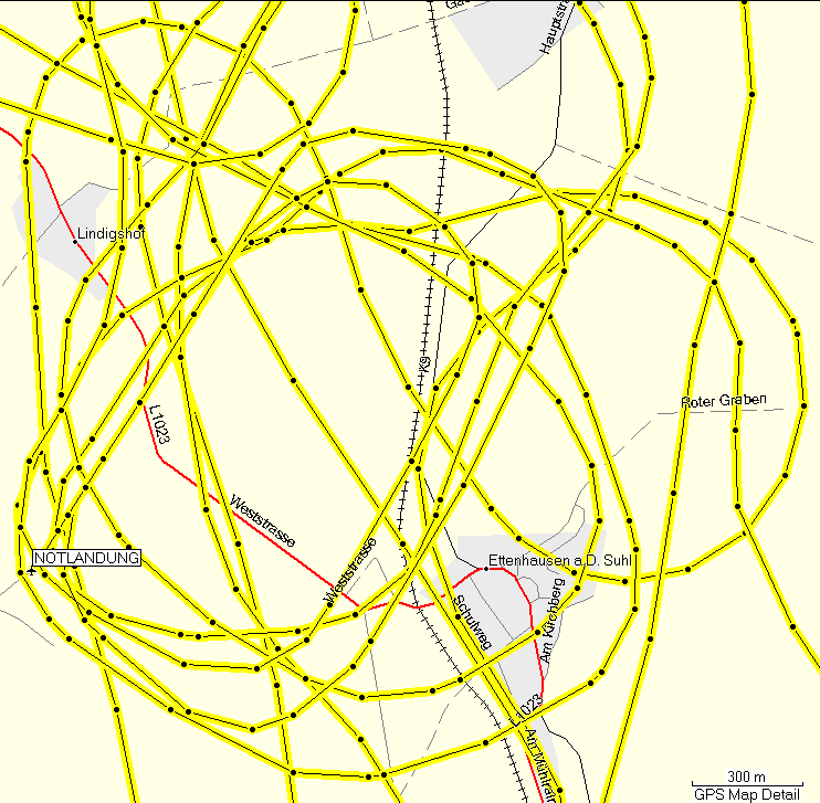 Der ehemalige Agrar-Flugplatz bei Marksuhl, den Sie erwähnen, den ich ja etliche Male überflogen haben muss und der ganz nah bei meinem Landeplatz liegt, ist allerdings eine Überraschung für mich. Es wäre äußerst hilfreich gewesen, wenn ich ihn gekannt hätte. Er steht aber leider nicht in den offiziellen Listen, wie z.B. im Jeppesen Bottlang Airfield Manual, und ist auch auf keiner der aktuellen Flugkarten verzeichnet.