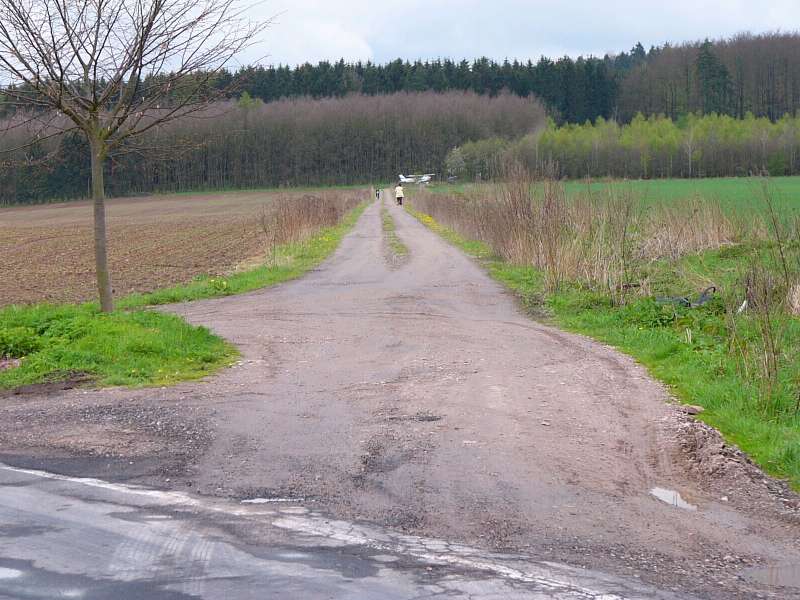Inzwischen hatte ich mir eine Menge Gedanken über den Start gemacht. Zunächst einmal musste ich zwischen einem Start auf demselben Feldweg, auf einem benachbarten Feld oder auf der Straße entscheiden. Die Straße wäre sehr vorteilhaft gewesen, aber bei genauer Betrachtung stellte sie sich wegen zu vieler Straßenbäume als vollkommen ungeeignet heraus.